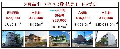 【 令和8年2月前半 2/1~2/14 】 アール・イー・ビーの アクセスランキング結果!発表\(^o^)/ 1 パルハウス前橋 前橋市朝倉町2丁目 、 2.8万円 、 1K 104 2 カーサ・シエナ 前橋市 …
