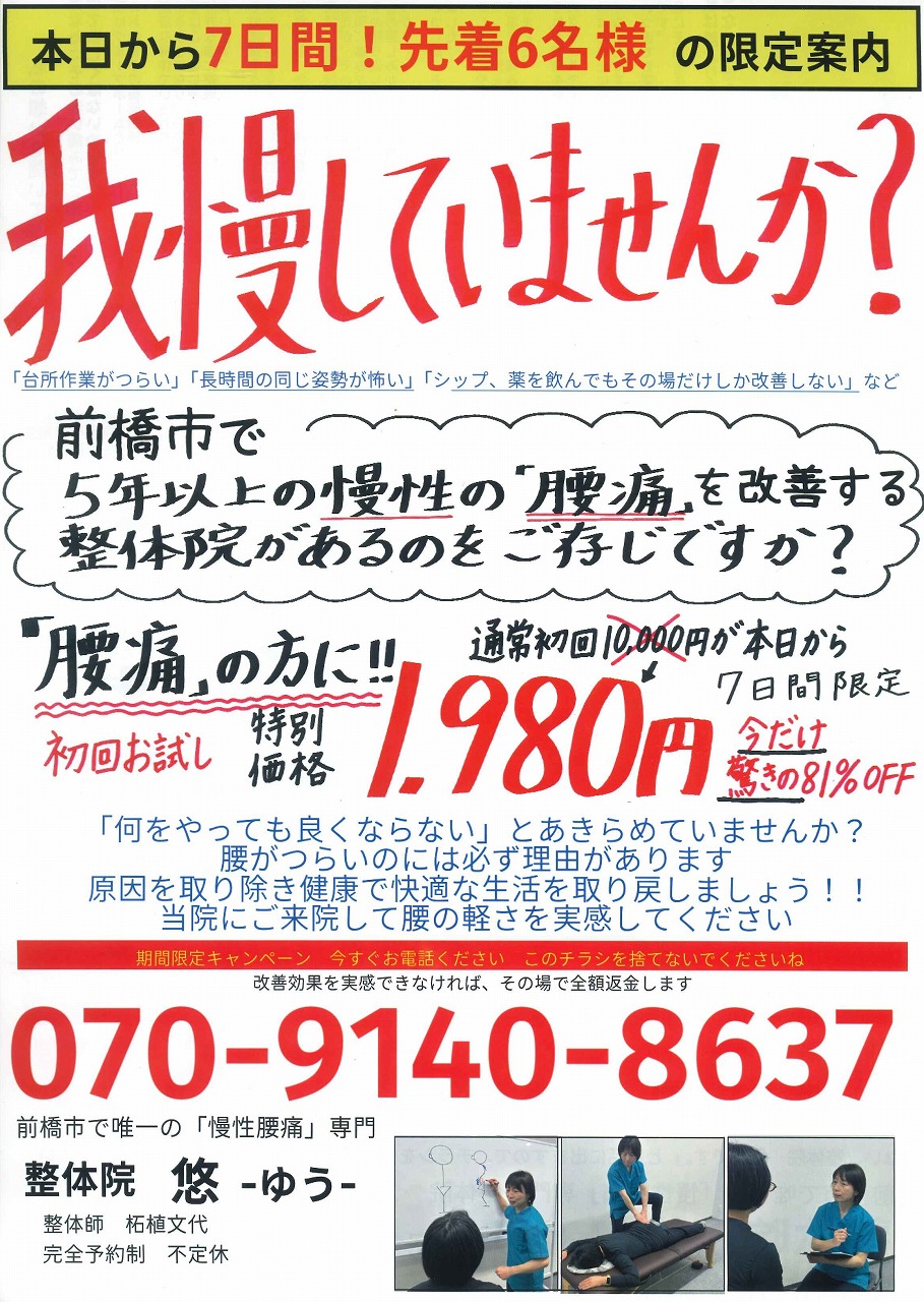 【開店情報】@前橋 前橋市で唯一の「慢性腰痛」専門【 整体院 悠 -ゆう- 】 前橋の新店舗 vol.33 | アール・イー・ビー