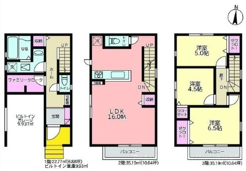 (1階)S、(2階)LDK16、(3階)洋6.5、(3階)洋5、(3階)洋4.5 |